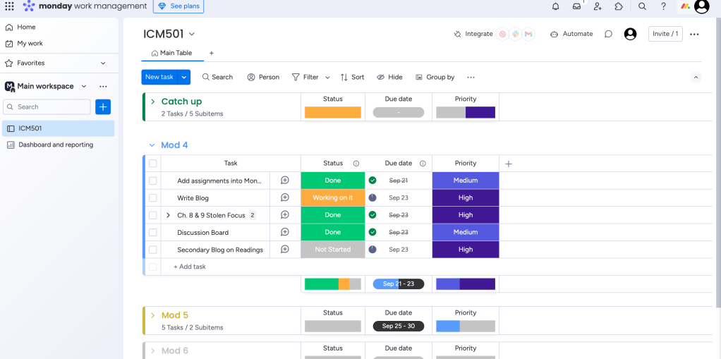 After I set up the workspace and added all of my course modules to the main dashboard, I spent some time playing around with the software and looked at what I could add to the space to make everything even more organized. I found the subitem option on Monday to be my favorite of the features that are offered. This gave me the ability to break things down even further from the main assignment and gave me the chance to look at things in a less stressful way. I often get overwhelmed by the bigger picture of a project or assignment, so having a subcategory helped me see things in a more controlled manner. Additionally, I like how I am able to add a status of where I am in completing a task. Switching an assignment from “working on it” to “done” has been really satisfying and lets me celebrate the smaller wins, even if it’s simply completing one of the subitems. I look forward to potentially trying other features that I haven’t got to try yet and am excited to find more strategies to help me to stay on top of things.