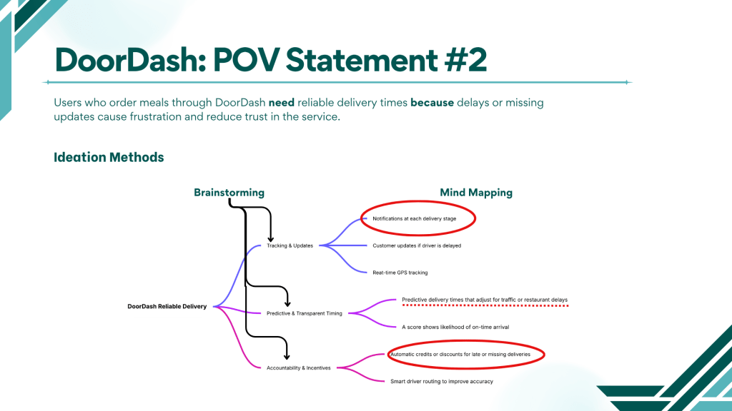 For the first DoorDash POV, which focused on transparent pricing, I started with brainstorming to capture a broad range of potential solutions. This helped me quickly record all ideas, including straightforward options such as providing a detailed fee breakdown at checkout or clearly displaying delivery costs.