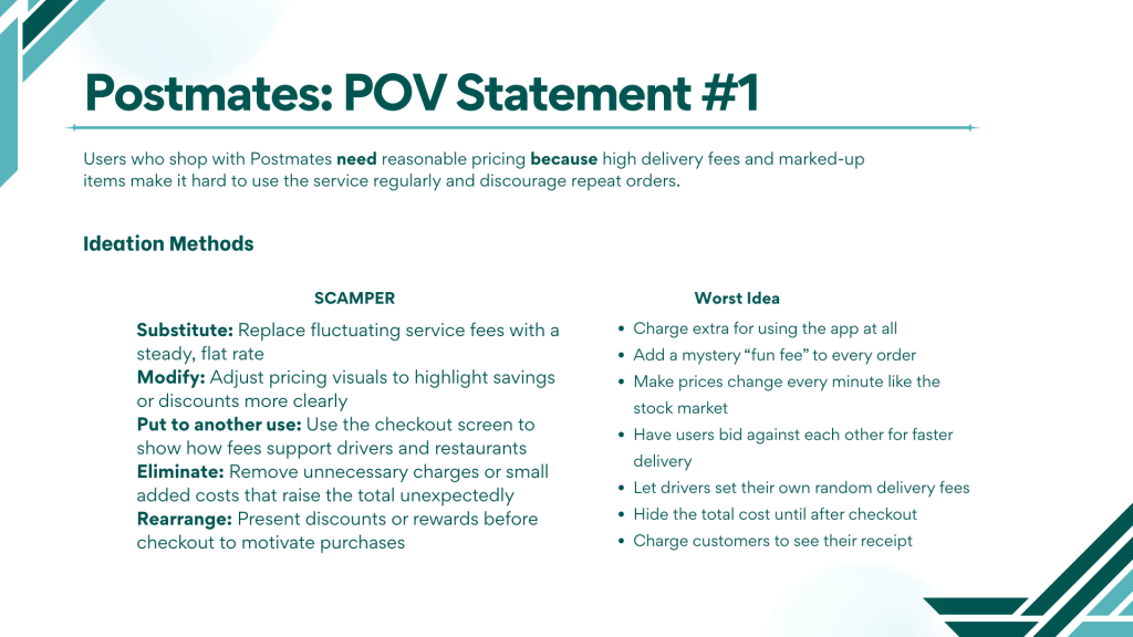 For the first Postmates POV, which focused on reasonable pricing, I began with the SCAMPER technique to explore ways the pricing system could be modified, simplified, or combined with other features. This approach allowed me to generate structured ideas and consider practical adjustments, such as eliminating hidden fees or bundling deliveries to reduce costs.