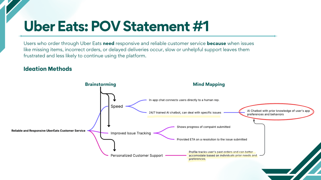 For the first Uber Eats POV, which focused on responsive customer service, I began by generating a wide range of ideas to explore all possible solutions. I then applied mind mapping to organize these ideas into categories such as speed, accessibility, and priority issues. This visual approach made it easier to identify patterns and connections among solutions, which clarified which ideas were most practical and impactful.