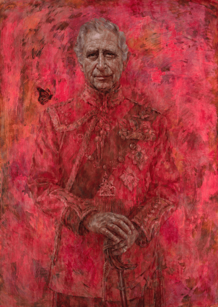 Jonathan Yeo’s 2024 portrait of King Charles III seems to show royalty in a new way compared to the previous portraits. This time, texture is used as a way to emphasize his presence, with bold brushstrokes, blurred details, and a thoughtful pose instead of the usual crowns or thrones. He is placed against a background of strong red brushstrokes that feel energetic and emotional.
