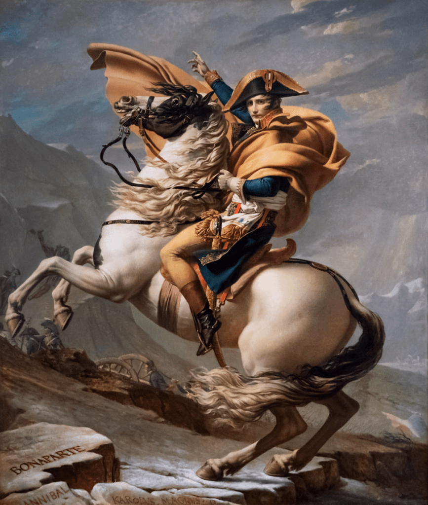 Napoleon’s portrait tells a story through action and composition. In Jacques-Louis David’s Napoleon Crossing the Alps, Napoleon is shown on a rearing horse, pointing forward with determination, with his cloak and the rugged mountains around him adding drama and movement. Every part of the painting works together to communicate his identity as a strong and decisive leader. The gesture of his hand, the angle of his body, and the steep landscape all highlight his courage and control, showing how artistic choices can shape the way we perceive power.